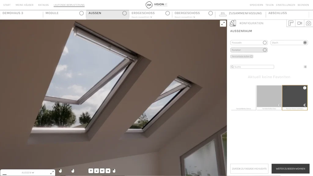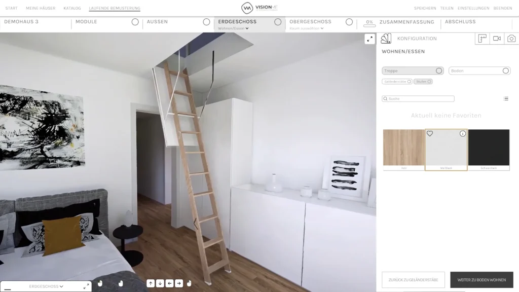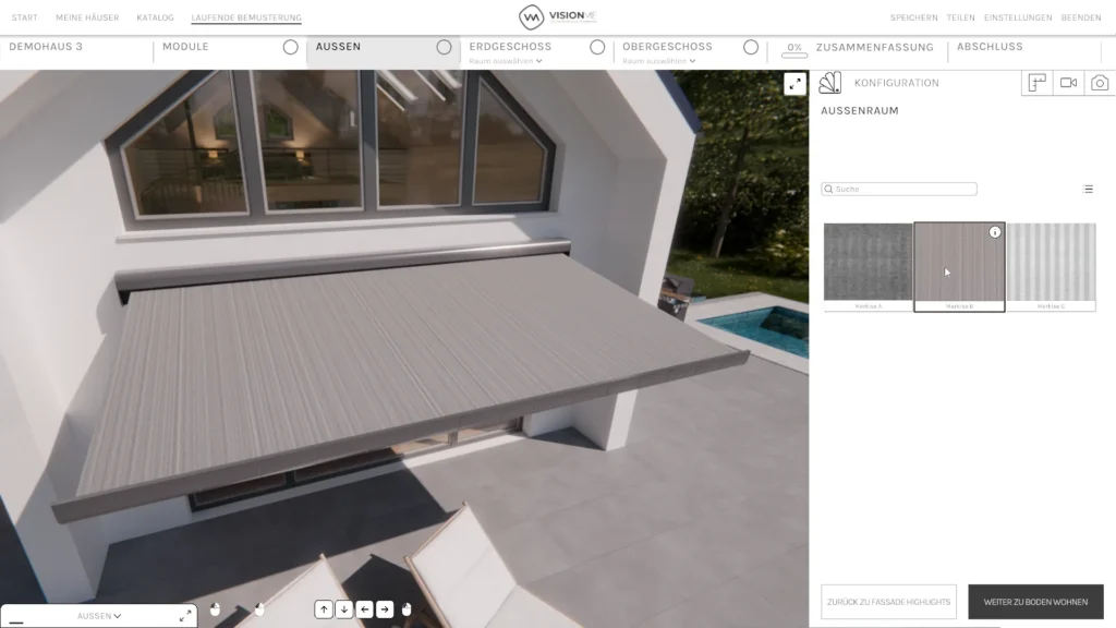 Die VISIONME Technologie ermöglicht es, verschiedenste Komponenten wie Materialien, Oberflächen, Größen, Zubehörteile oder Ausstattungen direkt auszuwählen und miteinander zu kombinieren. Änderungen sind jederzeit möglich und werden sofort visuell dargestellt.